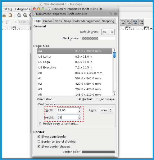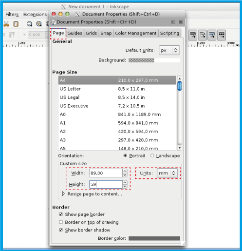 .Zorg ervoor dat u 4 mm (0,4 cm) aan de hoogte en breedte van uw document toevoegt. In het geval van het visitekaartje van 8,5 x 5,5 cm voegt u 8,9 x 5,9 cm in.