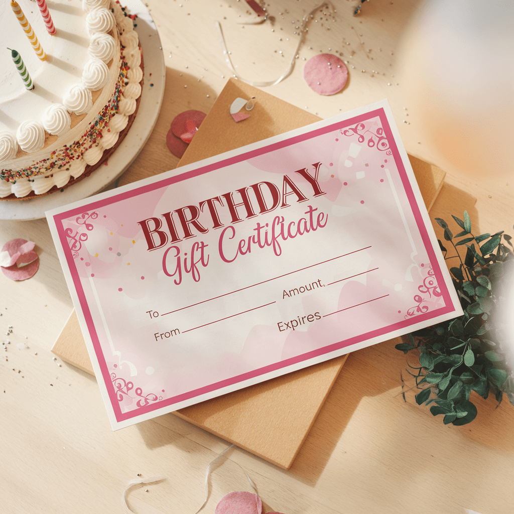 Aangepaste verjaardag cadeaubonnen voor vieringen. Perfect voor cadeaugeven, promoties en speciale gelegenheden. Ideaal voor winkels, salons en dienstverlenende bedrijven.