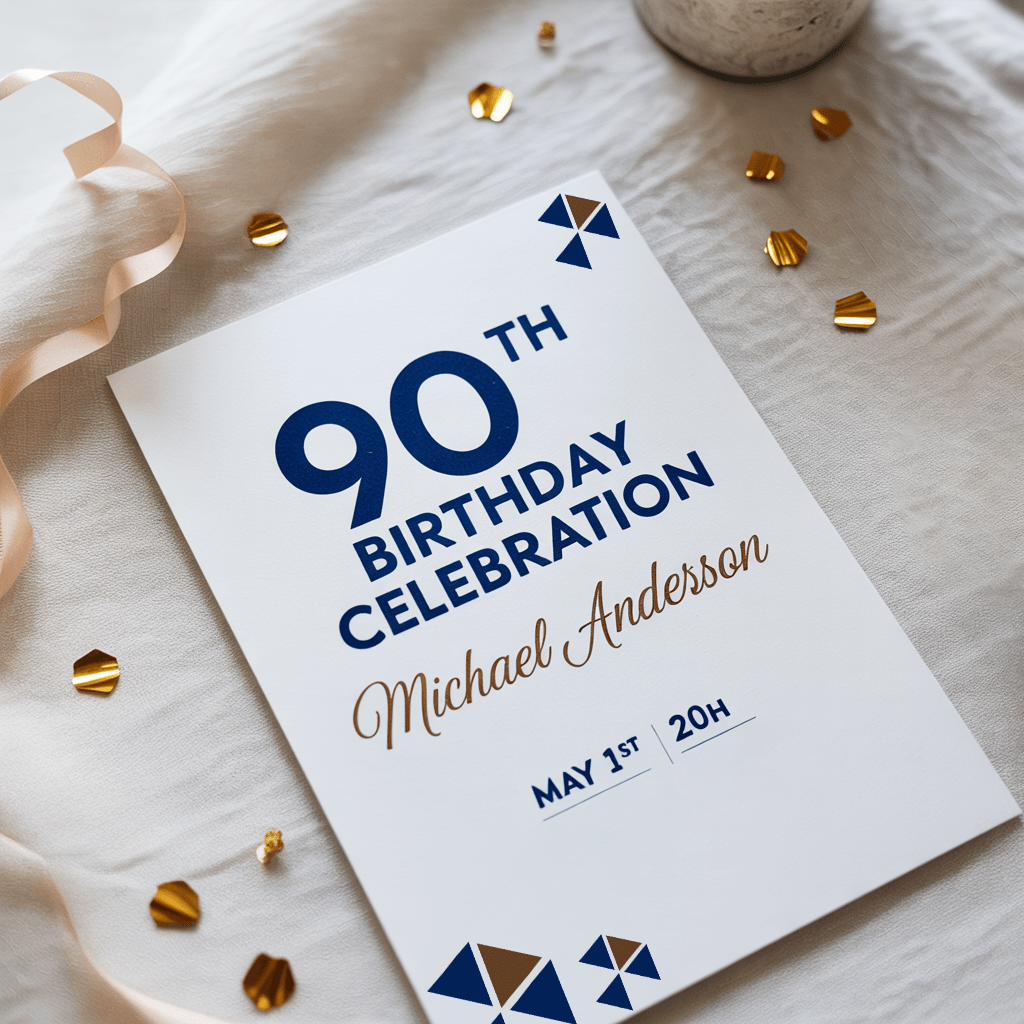 Elegante uitnodigingen voor 90e verjaardagsvieringen. Aanpasbaar met evenementdetails, namen en ontwerpen. Ideaal voor mijlpaalbijeenkomsten.